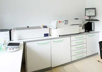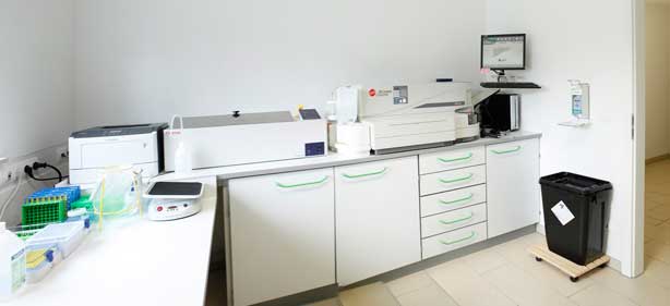 Das Labor ist für Patienten nicht zugängig. Der überwiegende Teil der uns zugewiesenen Laboruntersuchungen wird auch hier im Labor abgearbeitet. Deshalb haben wir hier auch eine moderne Ausstattung mit Laborgeräten, mit denen die speziellen immunologischen und hämostasiologischen Untersuchungen zeitnah und korrekt, entsprechend den gültigen Richtlinien durchgeführt werden können.